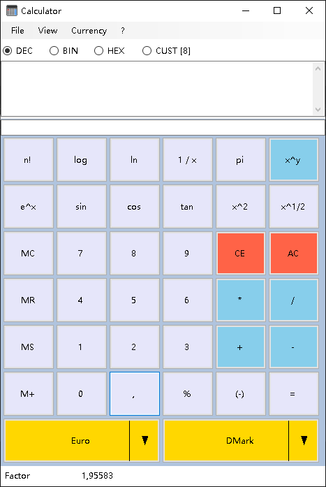 The calculator may also be used for conversation between different number systems (decimal, hexadecimal, binary, customer defined), units or currencies (which can be extended individually). The program is customizable in its window size and appearance. It is freeware. The program needs the .NET-framework 2.0 or above (which is already included in Windows since Windows Vista).