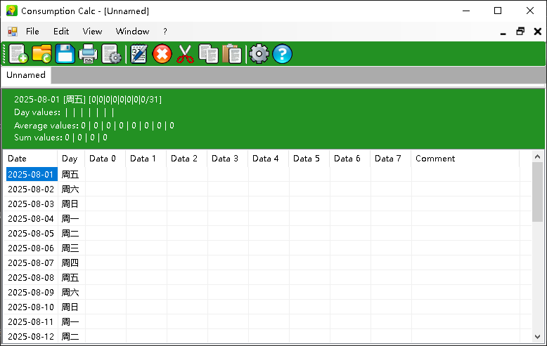 A simple program for capturing meter readings or consumption values. The data is captured for each month. Up to 8 values can be combined in one single file. The files may also be exported to CSV format which allos further editing in other programs (like Excel, Libre Office/ Open Office Calc).