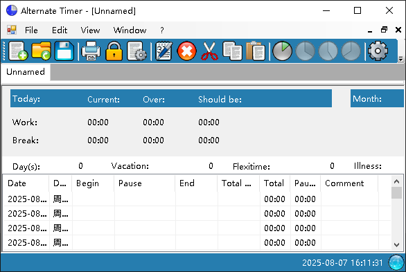 A program for managing/logging timings (daily work, internet usage etc.). To achieve this time-tables are created monthly. It is possible to use several time-tables per month and to combine time-tables to an overview-table (E.g. for a year). The program may also calculate a salary into those time-tables. It requires the Net-Framework 2.0 or above (which is already included in the operation system since Windows Vista).