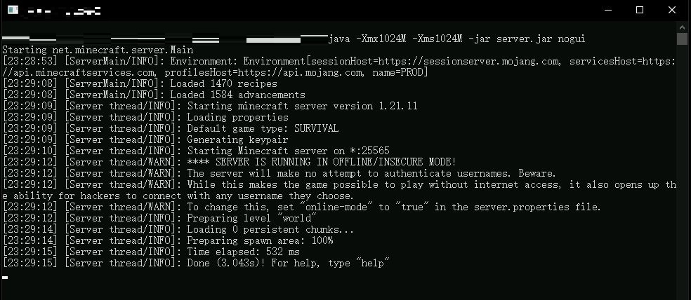 3. 首次运行(例如,在命令行中输入 java -jar server.jar),它会生成必要的配置文件和世界文件夹。