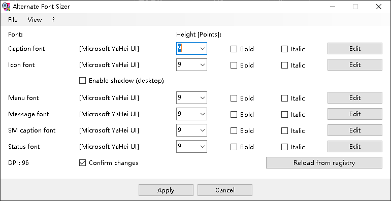 一个简单的程序,用于在Windows 10的秋季创意者更新后调整桌面字体大小,而无需缩放显示屏。该程序需要.NET框架2.0或更高版本(已包含在Windows 10中)。您也可以在其他Windows版本中使用它,但这些版本已经包含了该程序提供的设置。